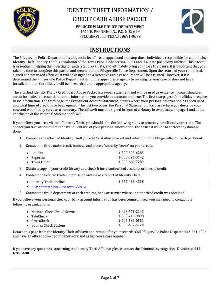 IDENTITY THEFT INFORMATION / CREDIT CARD ABUSE PACKET PFLUGERVILLE POLICE DEPARTMENT 1611 E. PFENNIG LN., P.O. BOX 679 PFLUGERVILLE, TEXAS 786910679 INSTRUCTIONS The Pflugerville Police Department