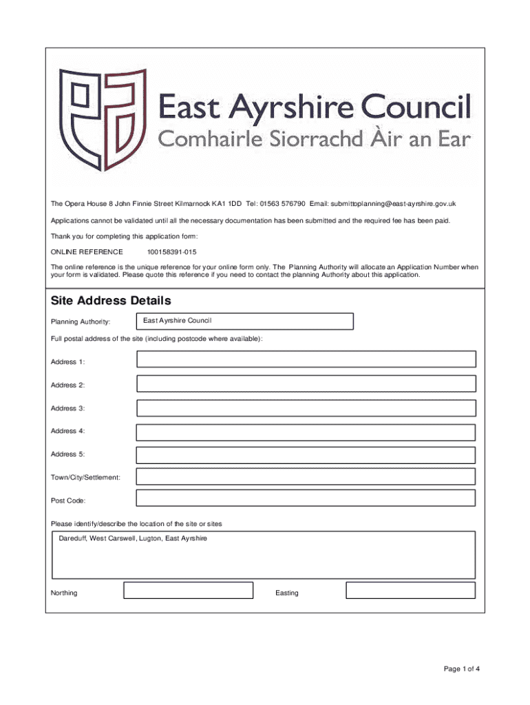 The Opera House 8 John Finnie Street Kilmarnock KA1 1DD Tel: 01563 576790 Email: submittoplanning@eastayrshire.gov.uk Applications cannot be validated until all the necessary documentation has been submitted and the required fee has been paid. Thank you for completing this application form: ONLINE REFERENCE100158391015The online reference is the unique reference for your online form only. The Planning Authority will allocate an Application Number when your form is validated. Please quote this