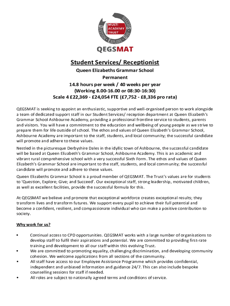 Student Services/ Receptionist Queen Elizabeth's Grammar School Permanent 14.8 hours per week / 40 weeks per year (Working 8.0016.00 or 08:3016:30) Scale 4 22,369 24,054 FTE (7,752 8,336 pro rata)
