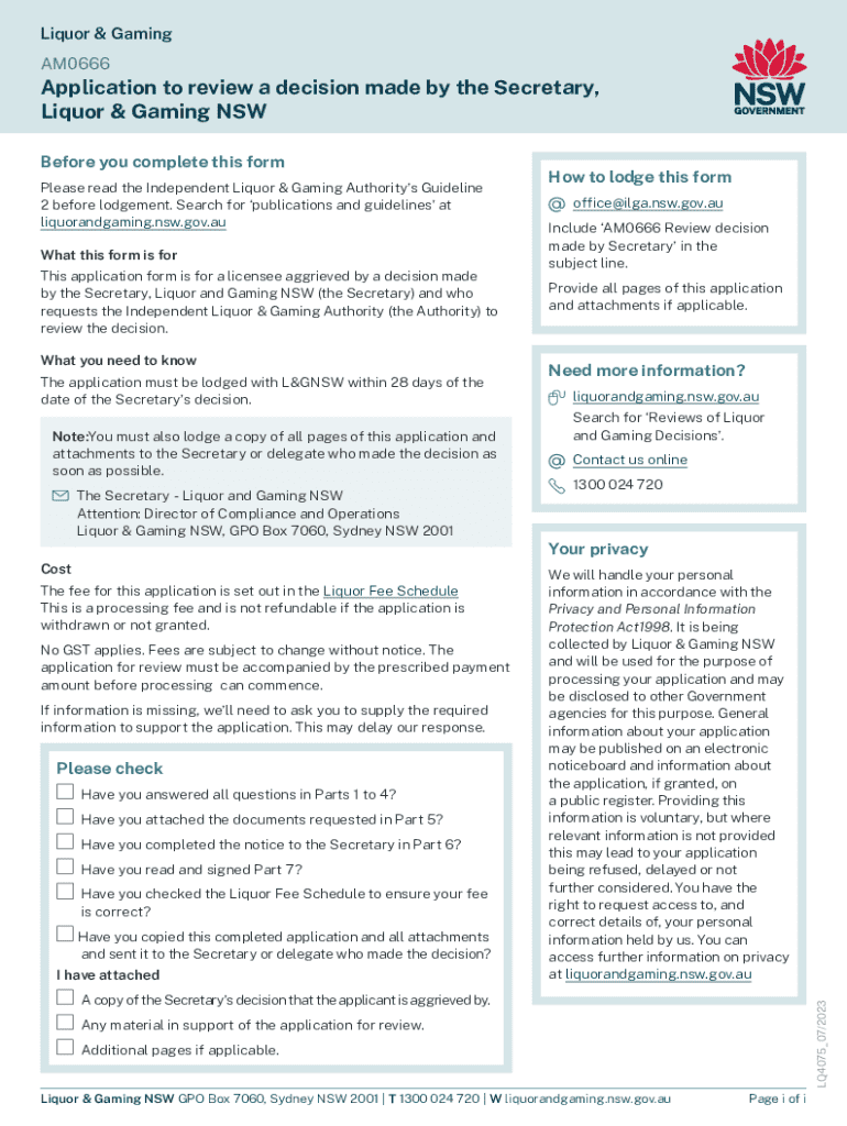 Liquor & Gaming AM0666Application to review a decision made by the Secretary, Liquor & Gaming NSW Before you complete this form Please read the Independent Liquor & Gaming Authorities Guideline 2