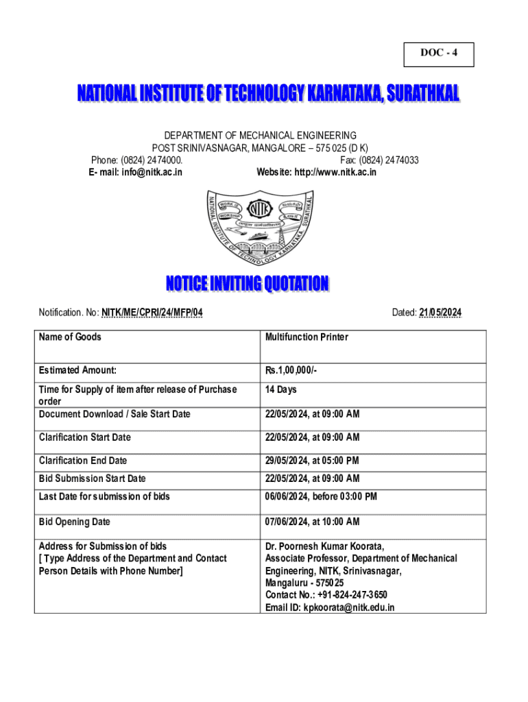 DOC 4DEPARTMENT OF MECHANICAL ENGINEERING POST SRINIVASNAGAR, MANGALORE 575 025 (D K) Phone: (0824) 2474000. Fax: (0824) 2474033 E mail: info@nitk.ac.in Website: http://www.nitk.ac.inNotification. No: NITK/ME/CPRI/24/MFP/04Dated: 21/05/2024Name of GoodsMultifunction PrinterEstimated Amount:Rs.1,00,000/Time for Supply of item after release of Purchase order Document Download / Sale Start Date14 DaysClarification Start Date22/05/2024, at 09:00 AMClarification End Date29/05/2024,