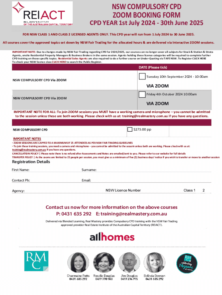 NSW COMPULSORY CPD ZOOM BOOKING FORMCPD YEAR 1st July 2024 30th June 2025 FOR NSW CLASS 1 AND CLASS 2 LICENSED AGENTS ONLY. This CPD year will run from 1 July 2024 to 30 June 2025. All courses cover