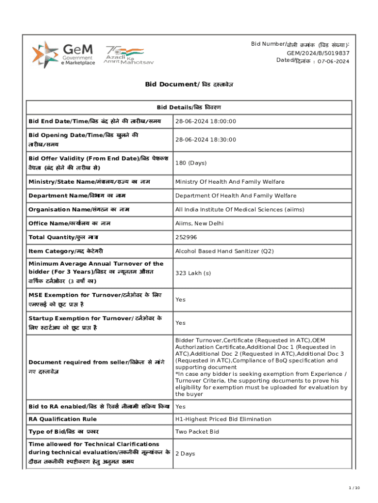 Bid Number/ ( ) : GEM/2024/B/5019837 Dated/ : 07062024Bid Document/ Bid Details/ Bid End Date/Time/ / Bid Opening Date/Time/ 28062024 18:00:00 28062024 18:30:00 / Bid Offer Validity (From End Date)/