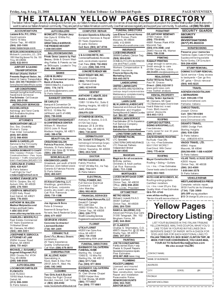 Friday, Aug. 8Aug. 21, 2008The Italian Tribune La Tribuna del PopoloPAGE SEVENTEENTHE ITALIAN YELLOW PAGES DIRECTORYThe Italian Yellow Pages Directory is designed to furnish you, our Italian American