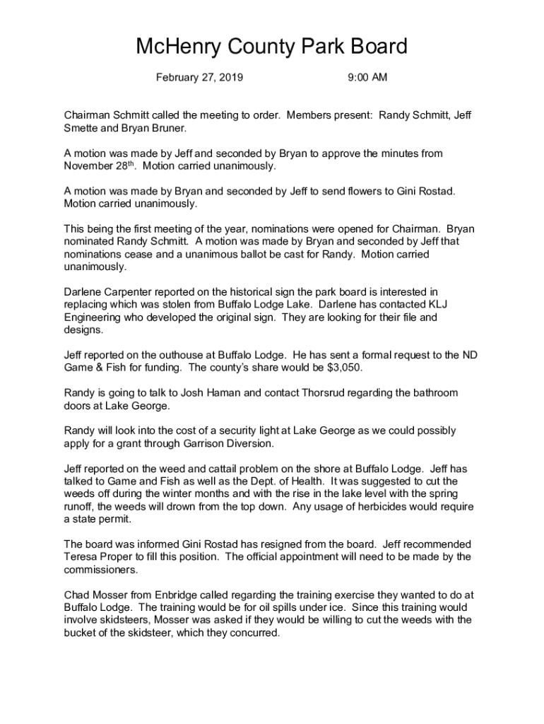 McHenry County Park Board February 27, 20199:00 AMChairman Schmitt called the meeting to order. Members present: Randy Schmitt, Jeff Smette and Bryan Bruner. A motion was made by Jeff and seconded by Bryan to approve the minutes from November 28th. Motion carried unanimously. A motion was made by Bryan and seconded by Jeff to send flowers to Gini Rostad. Motion carried unanimously. This being the first meeting of the year, nominations were opened for Chairman. Bryan nominated Randy Schmitt. A