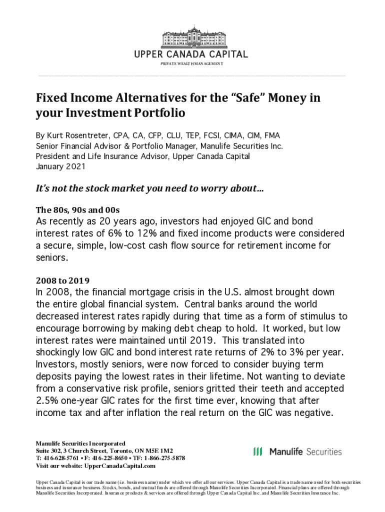U P P E R C A NA DA C A P ITA L PRIVATE WEALTH MANAGEMENT___Fixed Income Alternatives for the Safe Money in your Investment Portfolio By Kurt Rosentreter, CPA, CA, CFP, CLU, TEP, FCSI, CIMA, CIM, FMA Senior Financial Advisor & Portfolio Manager, Manulife Securities Inc. President and Life Insurance Advisor, Upper Canada Capital January 2021Its not the stock market you need to worry about The 80s, 90s and 00s As recently as 20 years ago, investors had enjoyed GIC and bond interest