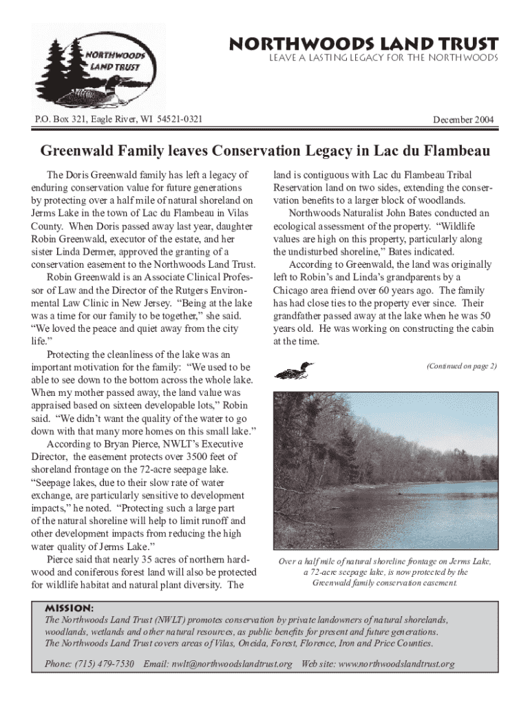 North woods Land Trust leave A lasting LEGACY FOR THE NORTHWARDS. O. Box 321, Eagle River, WI 545210321December 2004Greenwald Family leaves Conservation Legacy in Lac Du Flambe The Doris Greenwald