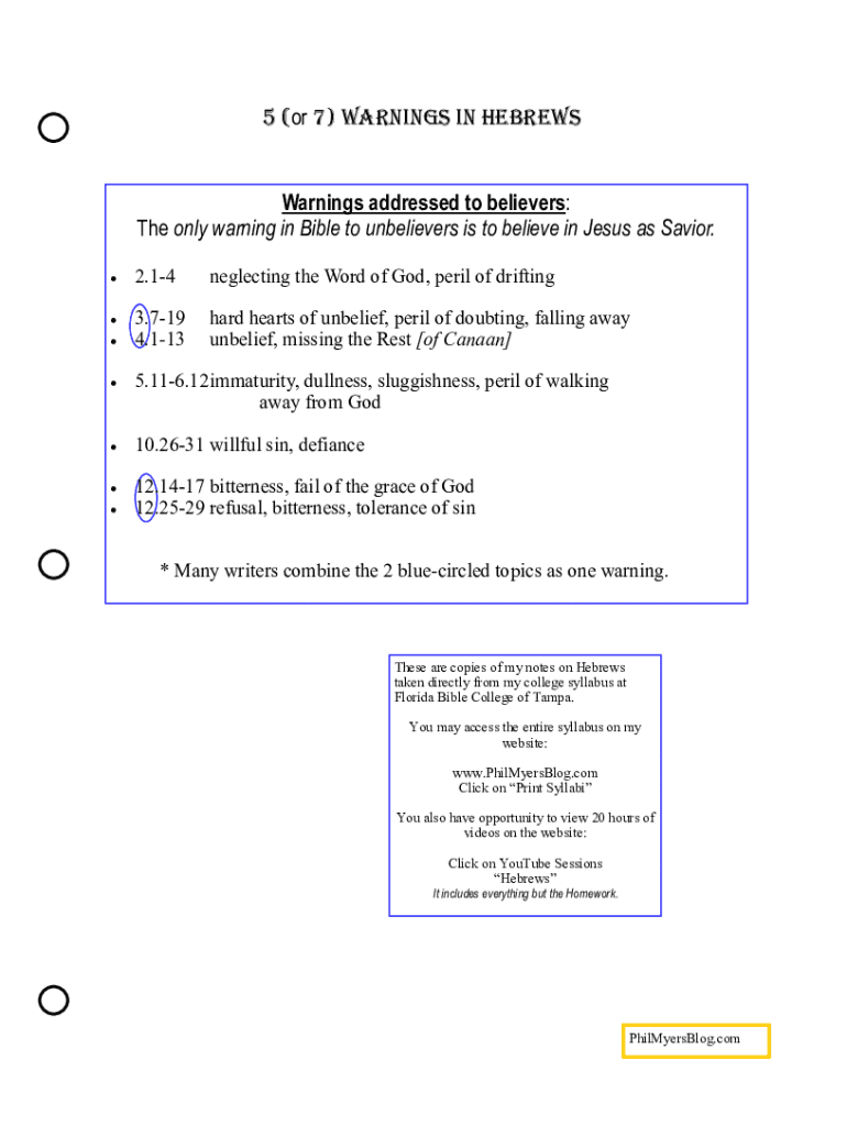 5 (or 7) warnings in hebrewsWarnings addressed to believers: The only warning in Bible to unbelievers is to believe in Jesus as Savior. 2.14neglecting the Word of God, peril of drifting 3.719 4.113hard