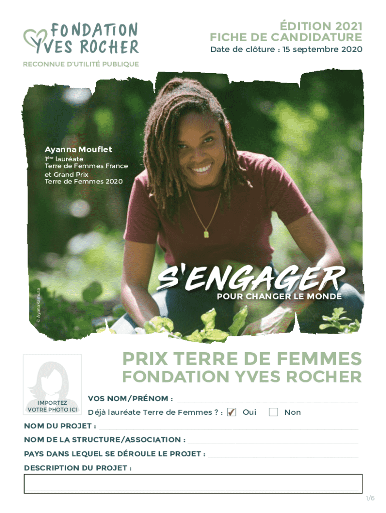 DITION 2021 FICHE DE CANDIDATURE Date de clture : 15 septembre 2020Ayanna Mouflet 1re laurate Terre de Femmes France et Grand Prix Terre de Femmes 2020 AyanaKamuraSENGAGERPOUR CHANGER LE MONDEPRIX