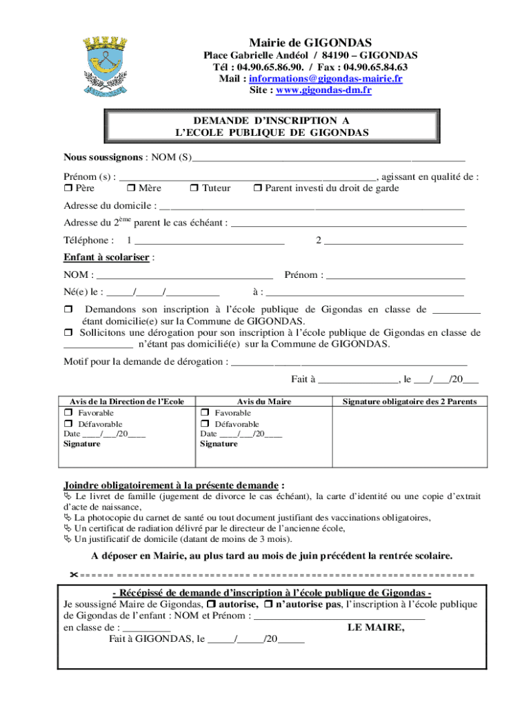 Mairie de GIGONDAS Place Gabrielle Andol / 84190 GIGONDAS Tl : 04.90.65.86.90. / Fax : 04.90.65.84.63 Mail : informations@gigondasmairie.fr Site : www.gigondasdm.fr DEMANDE DINSCRIPTION A LECOLE PUBLIQUE