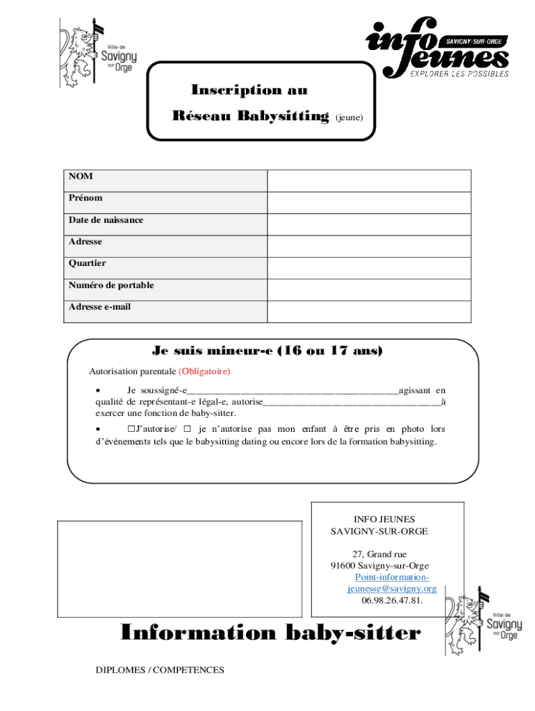 Obtenir le gratuit Formation Baby-sitting Fiche d'inscription :