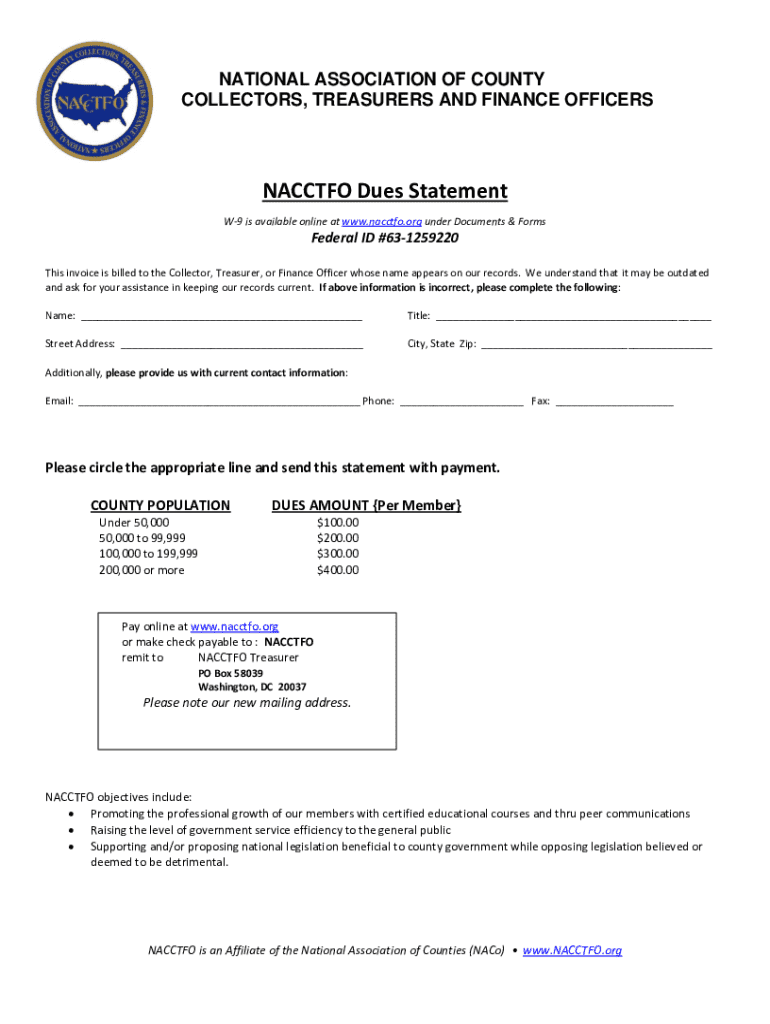 NATIONAL ASSOCIATION OF COUNTY COLLECTORS, TREASURERS AND FINANCE OFFICERSNACCTFO Dues Statement W9 is available online at www.nacctfo.org under Documents & FormsFederal ID #631259220 This invoice is billed to the Collector, Treasurer, or Finance Officer whose name appears on our records. We understand that it may be outdated and ask for your assistance in keeping our records current. If above information is incorrect, please complete the following: Name: ___Title: ___Street Address: ___City,