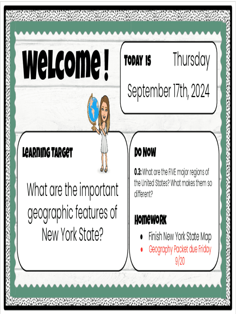 Welcome ! Learning TargetWhat are the important geographic features of New York State?Today isThursdaySeptember 17th, 2024 Do Now 0.3: What are the FIVE major regions of the United States? What makes them so different?Homework Finish New York State Map Geography Packet due Friday 9/20Lets discussNew York, New York New York is located in the North Eastern region of the United States. It contains a variety of geographic landforms including mountains, plateaus, forests, mines,