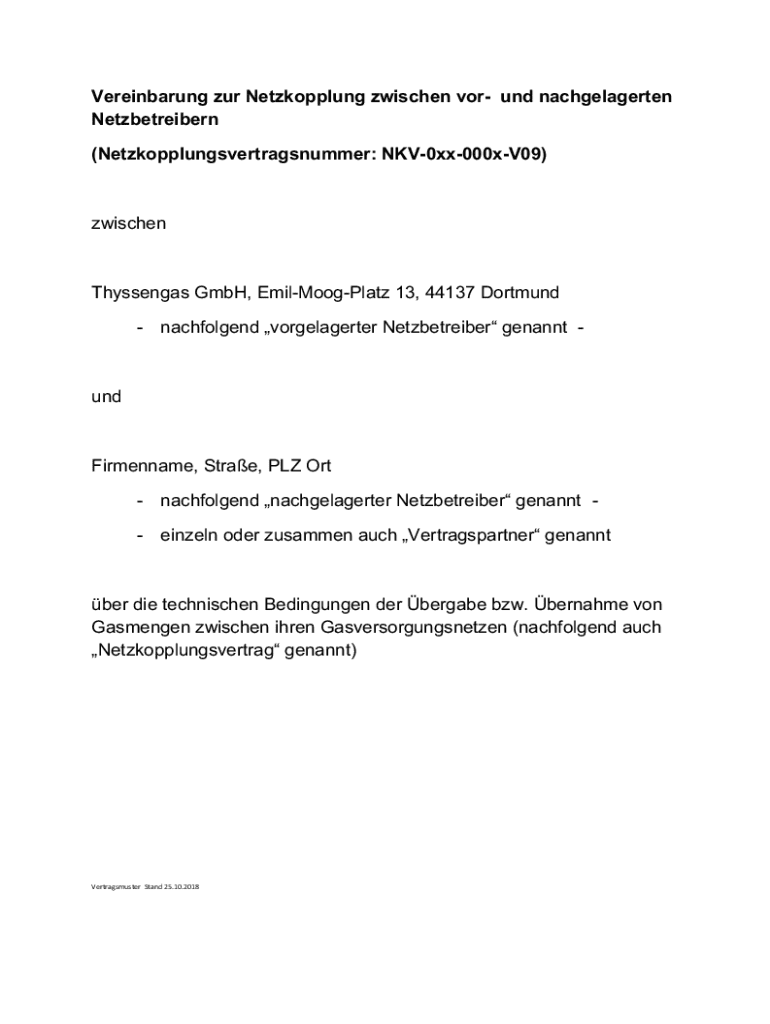 Vereinbarung zur Netzkopplung zwischen vor und nachgelagerten Netzbetreibern (Netzkopplungsvertragsnummer: NKV0xx000xV09)zwischenThyssengas GmbH, EmilMoogPlatz 13, 44137 Dortmund nachfolgend vorgelagerter