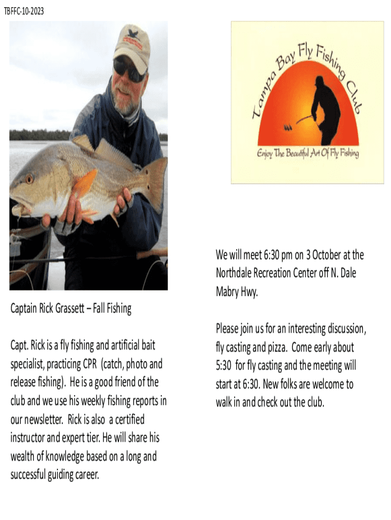 TBFFC102023We will meet 6:30 pm on 3 October at the Northdale Recreation Center off N. Dale Mabry Hwy. Captain Rick Grassett Fall Fishing Capt. Rick is a fly fishing and artificial bait specialist,