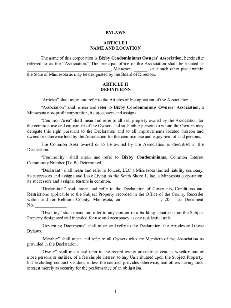BYLAWS ARTICLE I NAME AND LOCATION The name of this corporation is Bixby Condominiums Owners Association, hereinafter referred to as the Association. The principal office of the Association shall be located at ___, Minnesota ___, or at such other place within the State of Minnesota as may be designated by the Board of Directors. ARTICLE II DEFINITIONS Articles shall mean and refer to the Articles of Incorporation of the Association. Association shall mean and refer to Bixby Condominiums