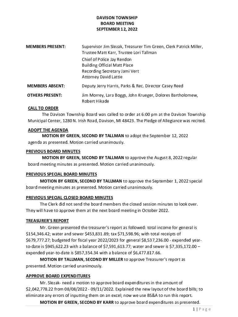 DAVISON TOWNSHIP BOARD MEETING SEPTEMBER 12, 2022MEMBERS PRESENT:Supervisor Jim Slezak, Treasurer Tim Green, Clerk Patrick Miller, Trustee Matt Karr, Trustee Lori Tallman Chief of Police Jay Rendon Building Official Matt Place Recording Secretary Jami Vert Attorney David LattieMEMBERS ABSENT:Deputy Jerry Harris, Parks & Rec. Director Casey ReedOTHERS PRESENT:Jim Morrey, Lara Boggs, John Krueger, Dolores Bartholomew, Robert HikadeCALL TO ORDER The Davison Township Board was called to