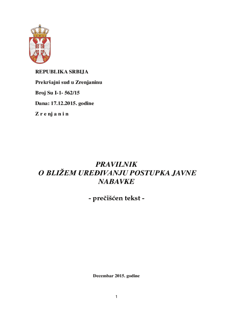 REPUBLIKA SRBIJA Prekrajni sud u Zrenjaninu Broj Su I1 562/15 Dana: 17.12.2015. godine Z r e nj a n i nPRAVILNIK O BLIEM UREIVANJU POSTUPKA JAVNE NABAVKE preien tekst Decembar 2015. godine1SADRAJ