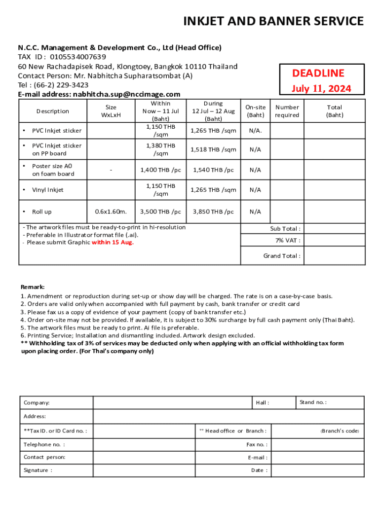 INKJET AND BANNER SERVICE N.C.C. Management & Development Co., Ltd (Head Office) TAX ID : 0105534007639 60 New Rachadapisek Road, Klongtoey, Bangkok 10110 Thailand Contact Person: Mr. Nabhitcha Supharatsombat (A) Tel : (662) 2293423 Email address: nabhitcha.sup@nccimage.com Description PVC Inkjet stickerPVC Inkjet sticker on PP boardPoster size A0 on foam boardVinyl InkjetRoll upSize WxLxH0.6x1.60m.Within Now 11 Jul (Baht) 1,150 THB /sqmDEADLINE July
