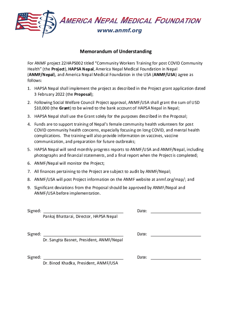 www.anmf.orgMemorandum of Understanding For ANMF project 22HAPS002 titled Community Workers Training for post COVID Community Health (the Project), HAPSA Nepal, America Nepal Medical Foundation in Nepal (ANMF/Nepal), and America Nepal Medical Foundation in the USA (ANMF/USA) agree as follows: 1. HAPSA Nepal shall implement the project as described in the Project grant application dated 3 February 2022 (the Proposal); 2. Following Social Welfare Council Project approval, ANMF/USA shall grant