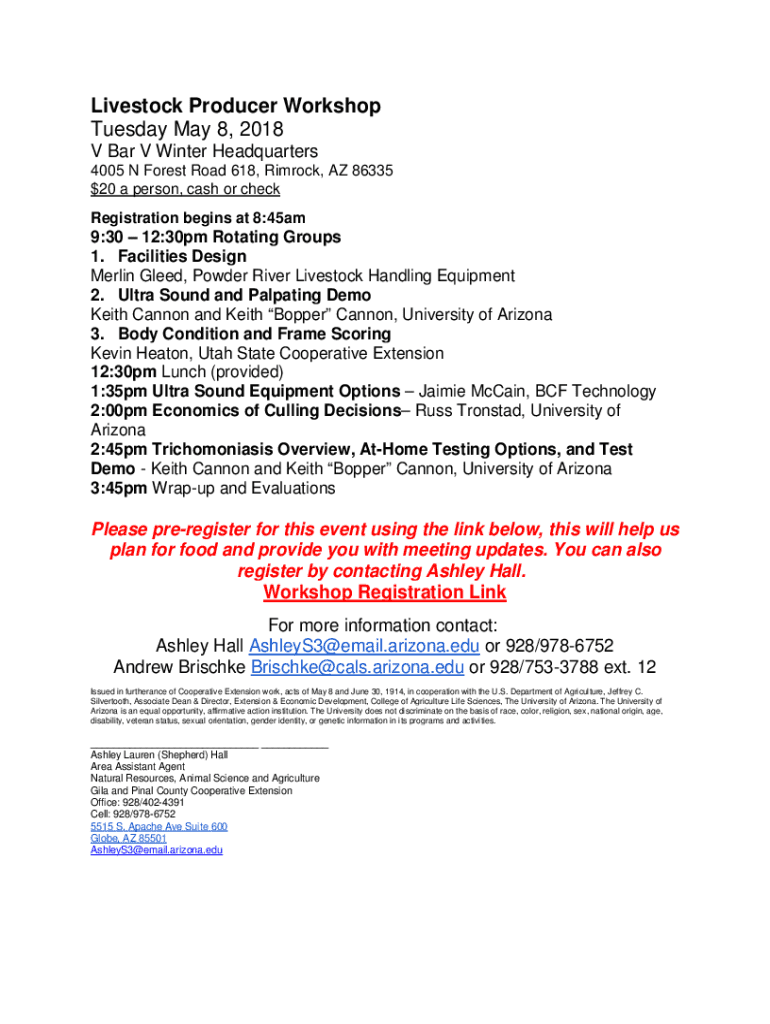 Livestock Producer Workshop Tuesday May 8, 2018 V Bar V Winter Headquarters 4005 N Forest Road 618, Rimrock, AZ 86335 $20 a person, cash or check Registration begins at 8:45am9:30 12:30pm Rotating Groups 1. Facilities Design Merlin Gleed, Powder River Livestock Handling Equipment 2. Ultra Sound and Palpating Demo Keith Cannon and Keith Bopper Cannon, University of Arizona 3. Body Condition and Frame Scoring Kevin Heaton, Utah State Cooperative Extension 12:30pm Lunch (provided) 1:35pm