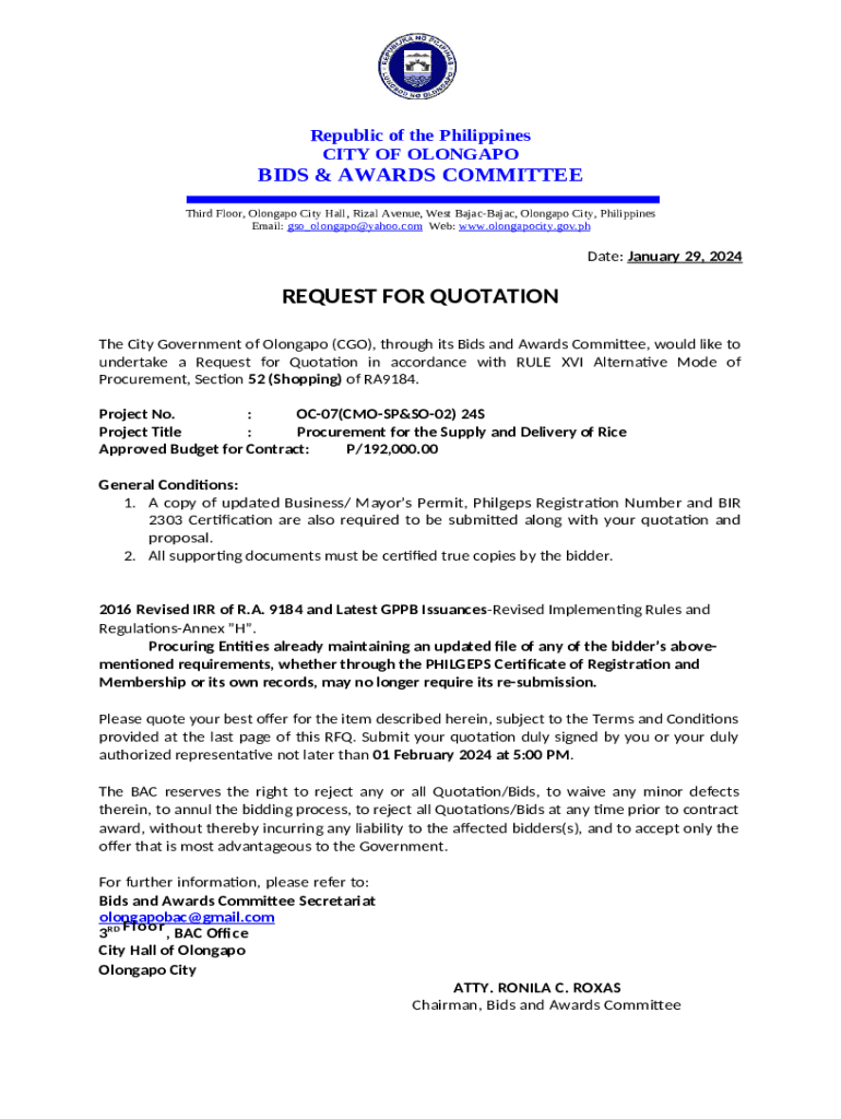 - Search for the OC-142(CMO-SP&SO-07) 24S- Procurement for the ... - olongapocity gov in the Search box on the top of the main page.