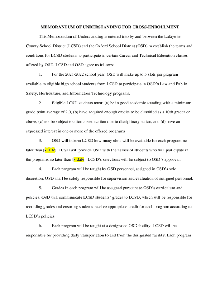MEMORANDUM OF UNDERSTANDING FOR CROSSENROLLMENT This Memorandum of Understanding is entered into by and between the Lafayette County School District (LCSD) and the Oxford School District (OSD) to establish the terms and conditions for LCSD students to participate in certain Career and Technical Education classes offered by OSD. LCSD and OSD agree as follows: 1.For the 20212022 school year, OSD will make up to 5 slots per programavailable to eligible high school students from LCSD to participate