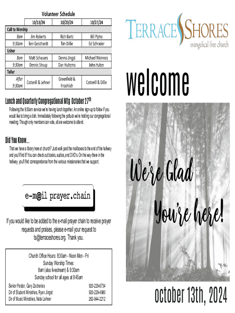 Volunteer ScheduleLunch and Quarterly Congregational Mtg March 31st, 2024October 27thwelcomeFollowing the 9:30am service were having lunch together. An online sign up to follow if you would like to