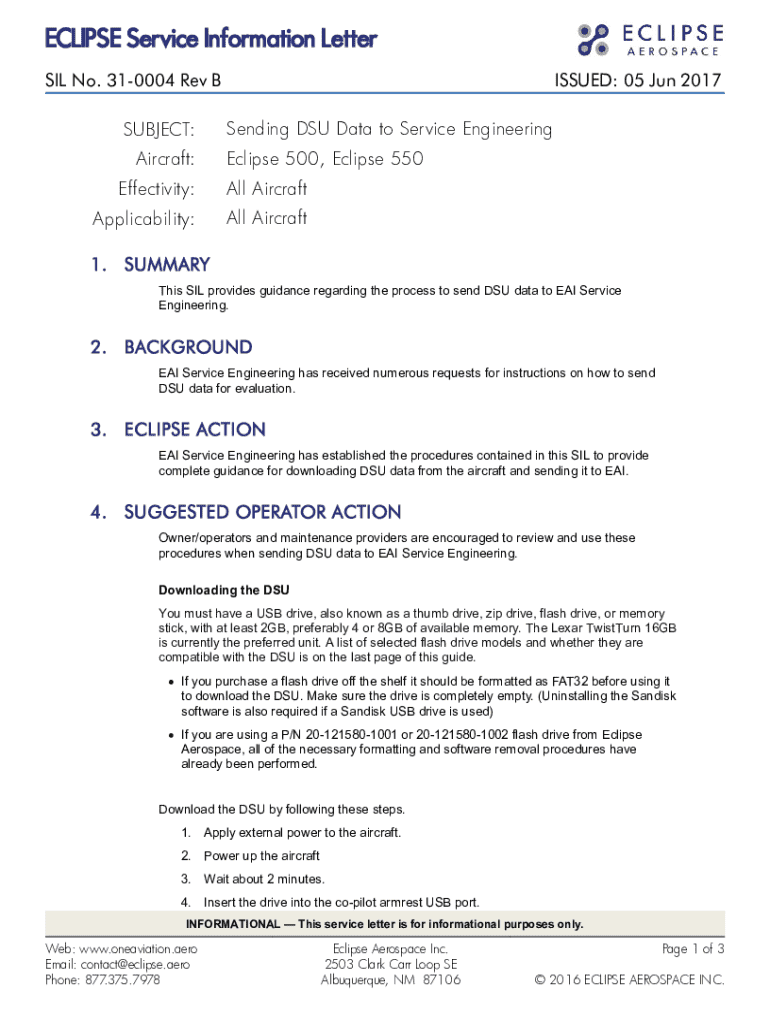 ECLIPSE Service Information Letter SIL No. 310004 Rev B SUBJECT: Aircraft:ISSUED: 05 Jun 2017 Sending DSU Data to Service Engineering Eclipse 500, Eclipse 550Effectivity:All AircraftApplicability:All Aircraft1.SUMMARY This SIL provides guidance regarding the process to send DSU data to EAI Service Engineering.2.BACKGROUND EAI Service Engineering has received numerous requests for instructions on how to send DSU data for evaluation.3.ECLIPSE ACTION EAI Service Engineering has