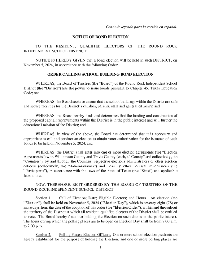 Continue land para la version en Español. NOTICE OF BOND ELECTION TO THE RESIDENT, QUALIFIED ELECTORS OF THE ROUND ROCK INDEPENDENT SCHOOL DISTRICT: NOTICE IS HEREBY GIVEN that a bond election will