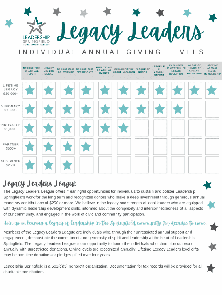 Legacy Leaders INDIVIDUAL RECOGNITION IN ANNUAL REPORTLEGACY LEADER DECALANNUALRECOGNITION RECOGNITION ON WEBSITE CERTIFICATEGIVINGFREE TICKET TO ANNUAL EXCLUSIVE VIP PLAQUE OF COMMUNICATION HONOR EVENTSPROFILE IN ANNUAL REPORTLEVELS GUEST OF EXCLUSIVE INVITATION TO HONOR AT LEGACY LEGACY RECEPTION RECEPTIONLIFETIME ANNUAL ALUMNI MEMBERSHIPLIFETIME LEGACY $10,000+VISIONARY $2,500+INNOVATOR $1,000+PARTNER $500+SUSTAINER $250+Legacy Leaders League The Legacy Leaders League