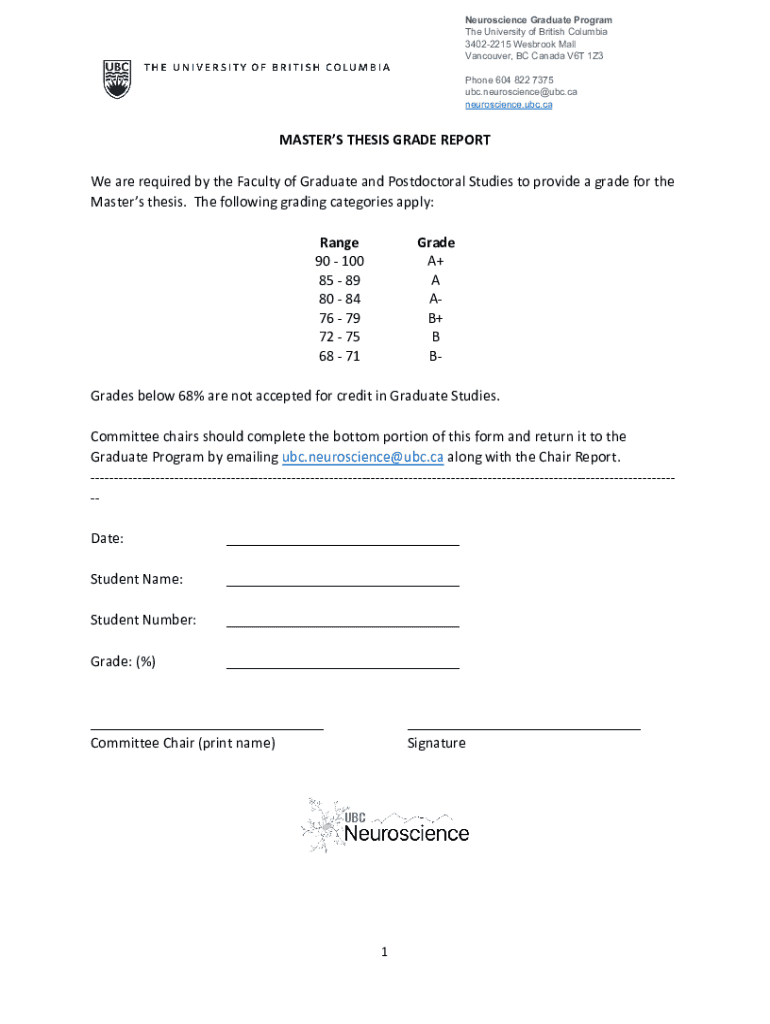 Neuroscience Graduate Program The University of British Columbia 34022215 Wesbrook Mall Vancouver, BC Canada V6T 1Z3 Phone 604 822 7375 ubc.neuroscience@ubc.ca neuroscience.ubc.caMASTERS THESIS GRADE REPORT We are required by the Faculty of Graduate and Postdoctoral Studies to provide a grade for the Masters thesis. The following grading categories apply: Range 90 100 85 89 80 84 76 79 72 75 68 71Grade A+ A AB+ B BGrades below 68% are not accepted for credit in Graduate Studies