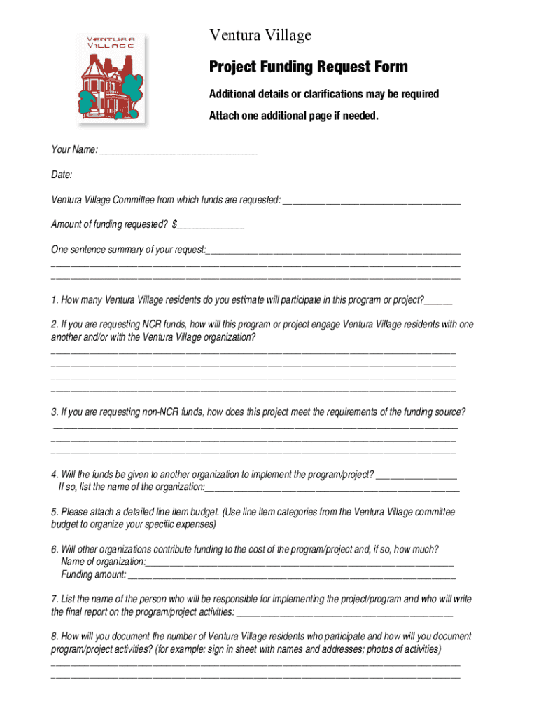 Ventura Village Project Funding Request Form Additional details or clarifications may be required Attach one additional page if needed. Your Name: ___ Date: ___ Ventura Village Committee from which funds are requested: ___ Amount of funding requested? $___ One sentence summary of your request:___ ___ ___ 1. How many Ventura Village residents do you estimate will participate in this program or project?___ 2. If you are requesting NCR funds, how will this program or project engage Ventura...