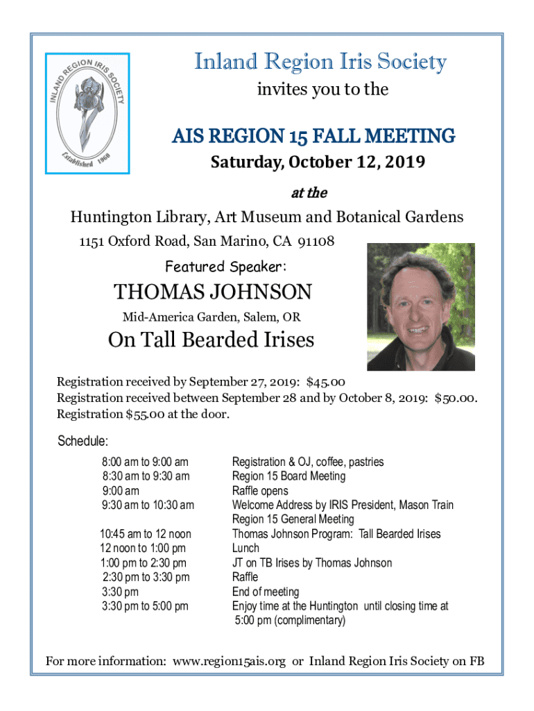 Inland Region Iris Society invites you to thesis REGION 15 FALL MEETING Saturday, October 12, 2019, at the Huntington Library, Art Museum and Botanical Gardens 1151 Oxford Road, San Marino, CA 91108