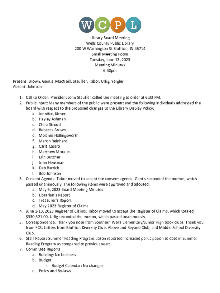 Library Board Meeting Wells County Public Library 200 W Washington St Bluffton, IN 46714 Small Meeting Room Tuesday, June 13, 2023 Meeting Minutes 6:30pm Present: Brown, Gentis, MacNeill, Stauffer,