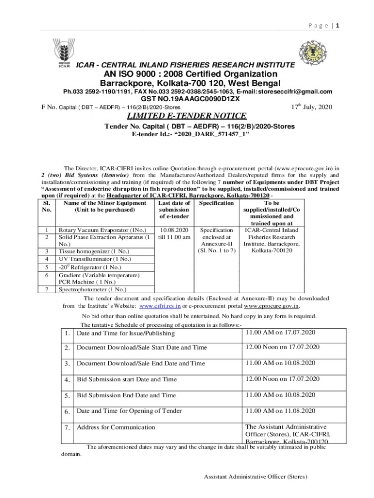 Page |1ICAR CENTRAL INLAND FISHERIES RESEARCH INSTITUTEAN ISO 9000 : 2008 Certified Organization Barrackpore, Kolkata700 120, West Bengal Ph.033 25921190/1191, FAX No.033 25920388/25451063, Email: storeseccifri@gmail.comGST NO.19AAAGC0090D1ZX F No. Capital ( DBT AEDFR) 116(2/B)/2020Stores17th July, 2020LIMITED ETENDER NOTICE Tender No. Capital ( DBT AEDFR) 116(2/B)/2020Stores Etender Id.: 2020_DARE_571457_1The Director, ICARCIFRI invites online Quotation through eprocurement portal (www