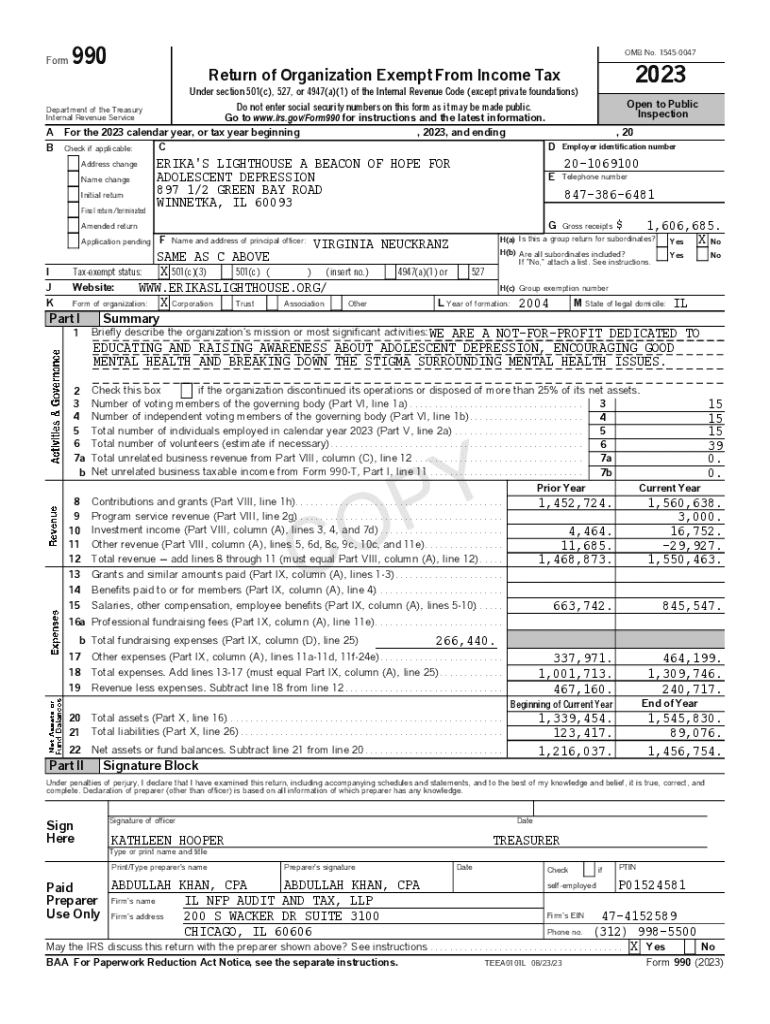 Form990OMB No. 154500472023Return of Organization Exempt From Income Tax Under section 501(c), 527, or 4947(a)(1) of the Internal Revenue Code (except private foundations)Do not enter social security numbers on this form as it may be made public. Go to www.irs.gov/Form990 for instructions and the latest information. For the 2023 calendar year, or tax year beginning , 2023, and ending C D Check if applicable:Open to Public InspectionDepartment of the Treasury Internal Revenue ServiceA BAddress