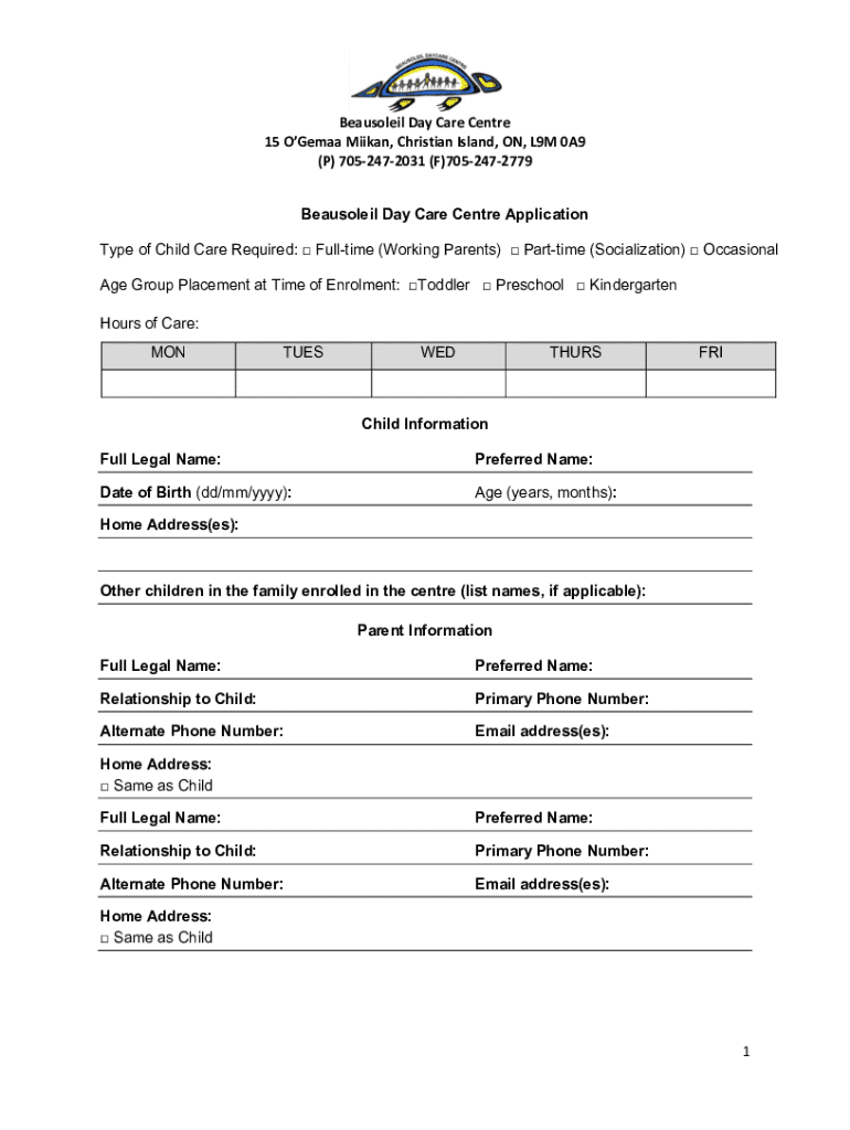 Get the free Beausoleil First Nation - Christian Island - Day Care Centre