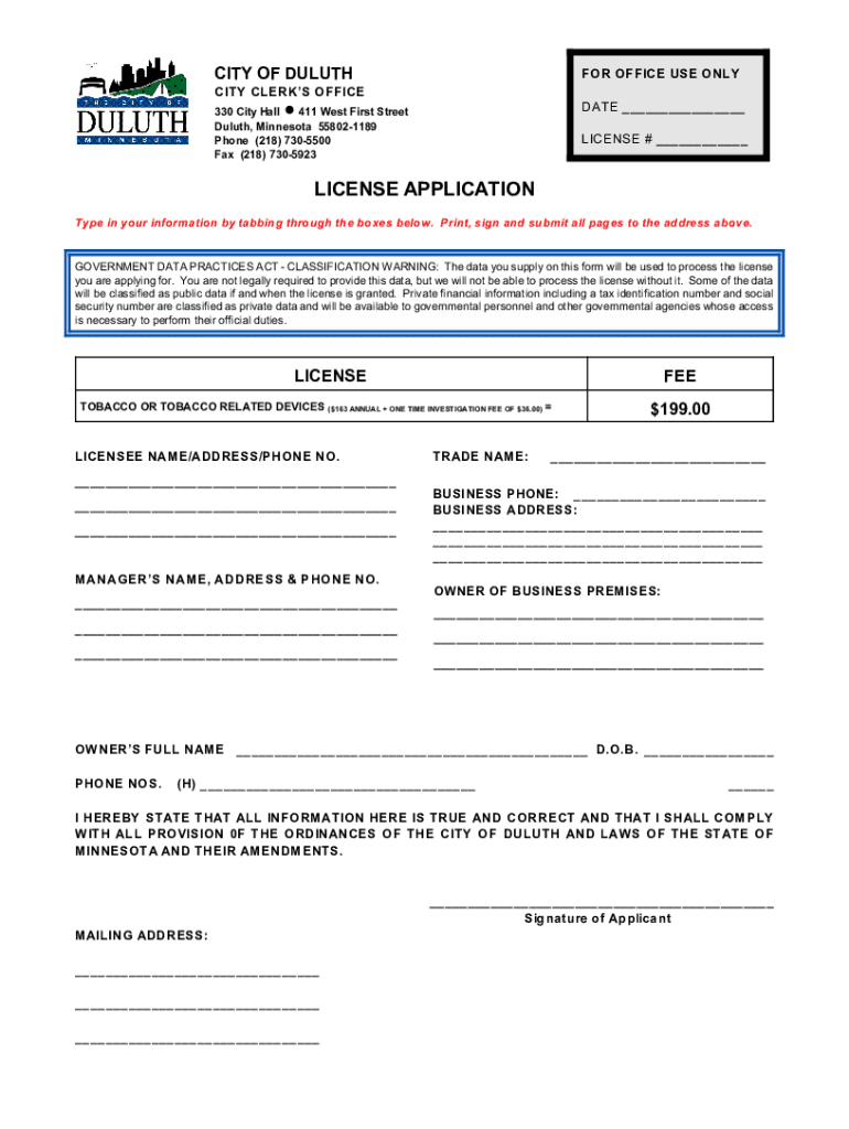 CITY OF DULUTHFOR OFFICE USE ONLY330 City Hall ! 411 West First Street Duluth, Minnesota 558021189 Phone (218) 7305500 Fax (218) 7305923DATE ___CITY CLERKS OFFICELICENSE # ___LICENSE APPLICATION Type