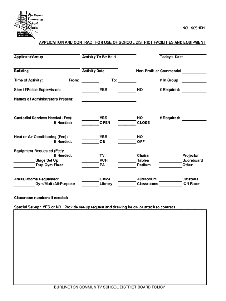 The 9051R1 form is an essential document that educational districts utilize to manage and facilitate the use of their facilities. This form embodies the legal framework governing how school properties can be utilized for various activities, ensuring that the interests of the district and the community at large are upheld. Understanding the purpose and significance of this form is crucial for anyone looking to organize events or request facility usage effectively.