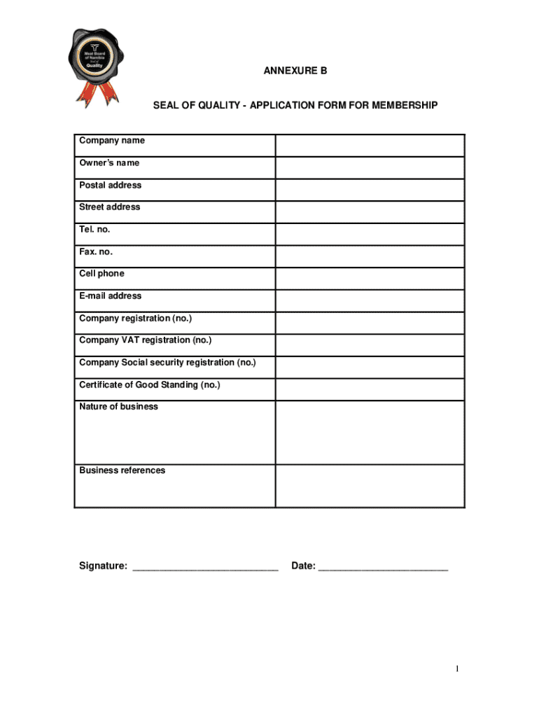 ANNEXURE BSEAL OF QUALITY APPLICATION FORM FOR MEMBERSHIPCompany name Owners name Postal address Street address Tel. no. Fax. no. Cell phone Email address Company registration (no.) Company VAT registration (no.) Company Social security registration (no.) Certificate of Good Standing (no.) Nature of businessBusiness referencesSignature: ___Date: ___1
