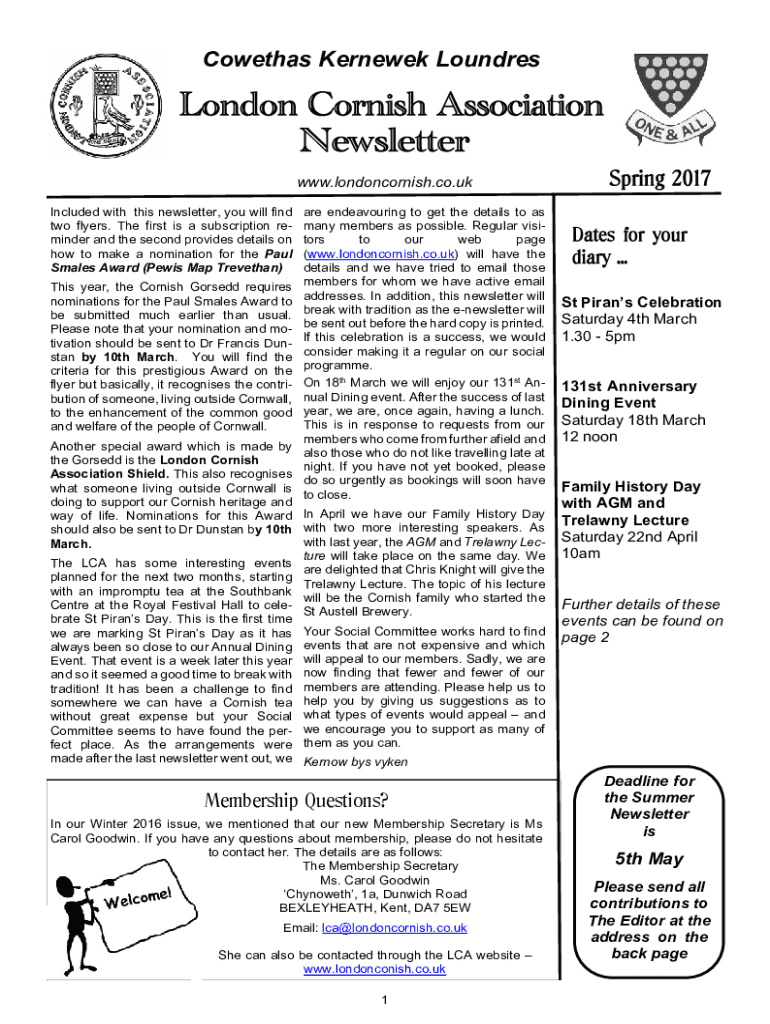 Cowethas Kernewek Loundreswww.londoncornish.co.uk Included with this newsletter, you will find two flyers. The first is a subscription reminder and the second provides details on how to make a nomination for the Paul Smales Award (Pewis Map Trevethan) This year, the Cornish Gorsedd requires nominations for the Paul Smales Award to be submitted much earlier than usual. Please note that your nomination and motivation should be sent to Dr Francis Dunstan by 10th March. You will find the criteria...