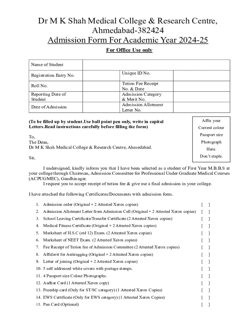 Dr M K Shah Medical College & Research Centre, Ahmedabad382424 Admission Form For Academic Year 202425 For Office Use only Name of Student Registration Entry No. Roll No. Reporting Date of Student