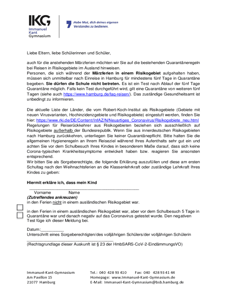 Liebe Eltern, liebe Schlerinnen und Schler, auch fr die anstehenden Mrzferien mchten wir Sie auf die bestehenden Quarantneregeln bei Reisen in Risikogebiete im Ausland hinweisen. Personen, die sich