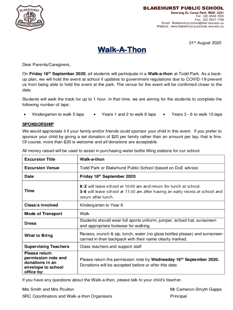 BLAKEHURST PUBLIC SCHOOL Dewrang St, Carss Park, NSW, 2221 Tel: (02) 9546 1555 Fax: (02) 9547 1796 Email: Blakehurstp.school@det.nsw.edu.au Website: www.blakehurstp.schools.nsw.edu.au31st August 2020WalkAThon Dear Parents/Caregivers, On Friday 18th September 2020, all students will participate in a Walkathon at Todd Park. As a backup plan, we will hold the event at school if updates to government regulations due to COVID19 prevent us from being able to hold the event at the park. The venue