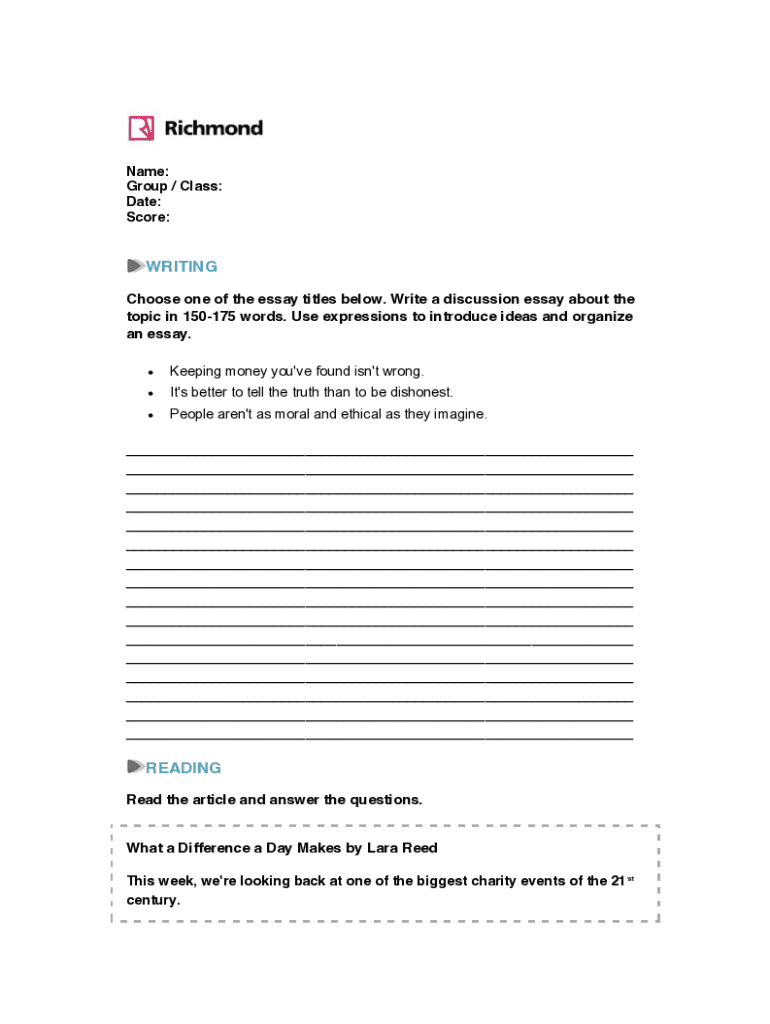 Name: Group / Class: Date: Score:WRITING Choose one of the essay titles below. Write a discussion essay about the topic in 150175 words. Use expressions to introduce ideas and organize an essay. Keeping