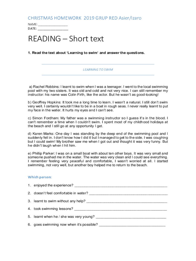 CHRISTMAS HOMEWORK 2019 GROUP RED Easier/Zero NAME: ___ DATE: ___READING Short text 1. Read the text about Learning to swim and answer the questions. LEARNING TO Swim) Rachel Robbins: I learned to