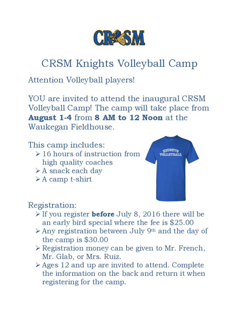 RSM Knights Volleyball Camp Attention Volleyball players! YOU are invited to attend the inaugural RSM Volleyball Camp! The camp will take place from August 14 from 8 AM to 12 Noon at the Waukegan