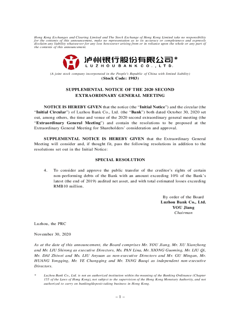 Hong Kong Exchanges and Clearing Limited and The Stock Exchange of Hong Kong Limited take no responsibility for the contents of this announcement, make no representation as to its accuracy or completeness and expressly disclaim any liability whatsoever for any loss howsoever arising from or in reliance upon the whole or any part of the contents of this announcement.(A joint stock company incorporated in the Peoples Republic of China with limited liability)(Stock Code: 1983)SUPPLEMENTAL NOTICE