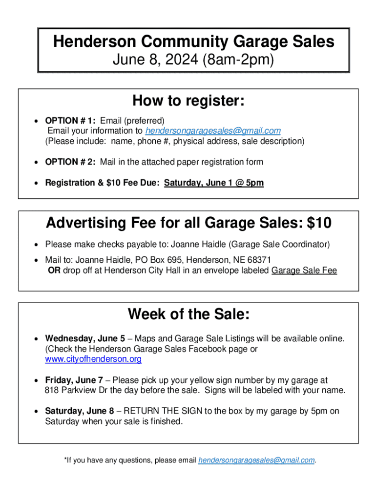 To fill out the registration for Henderson community-wide garage sales, residents must complete a designated form that typically includes their name, address, contact information, and details about their sale items.